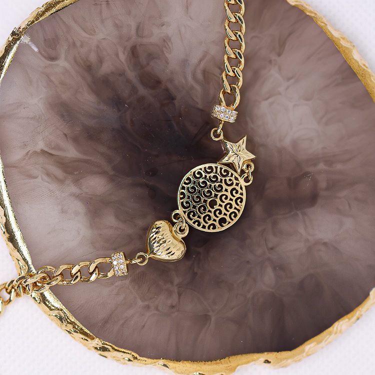 Złota bransoletka z ażurową blaszką, gwiazdką, sercem i cyrkoniami połączone łańcuszkiem o splocie pancerki z zapięciem federing regulującym długość.