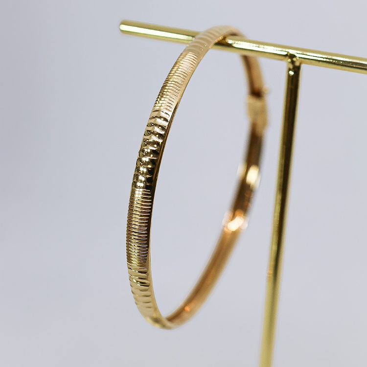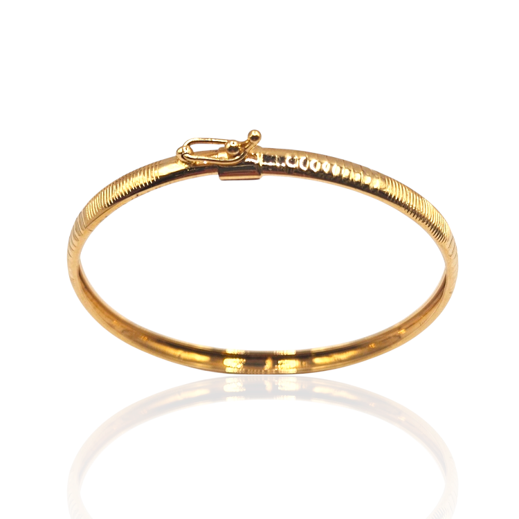 Złota bransoletka sztywna z diamentowanymi nacięciami z zapięciem szufladkowym z blokadką.