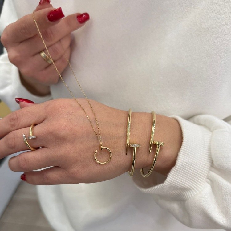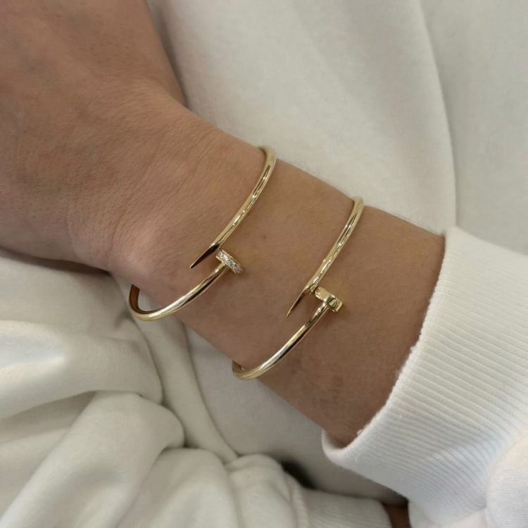 Złota bransoletka sztywna w kształcie gwoździa z dodatkiem białych cyrkonii.