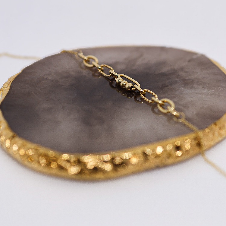 Złota bransoletka z ogniwkami i kuleczkami na łańcuszku o splocie ankierki z zapięciem typu federing regulującym długość.