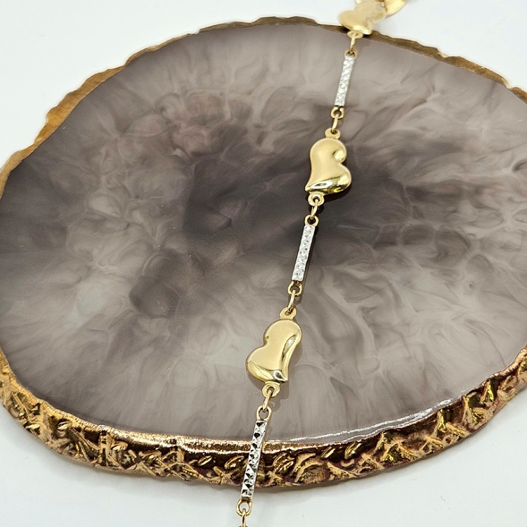 Złota bransoletka płaskie serduszka połączona elementami z diamentowanym białym złotem, zapięcie typu fasolka z regulacją długości .