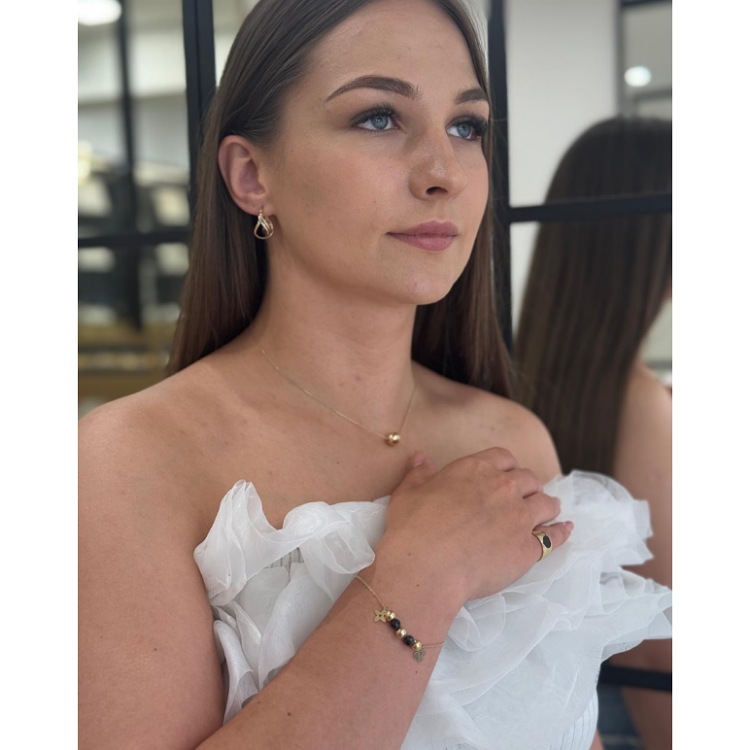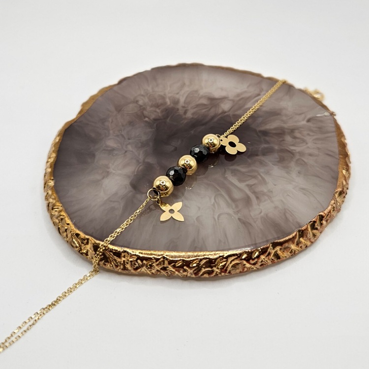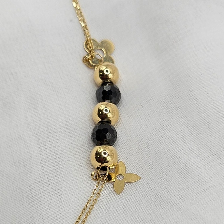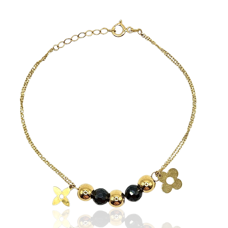 Złota bransoletka z czarnymi i złotymi kulkami połączona podwójnym łańcuszkiem ankierką na zapięcie typu federing regulującym długość.