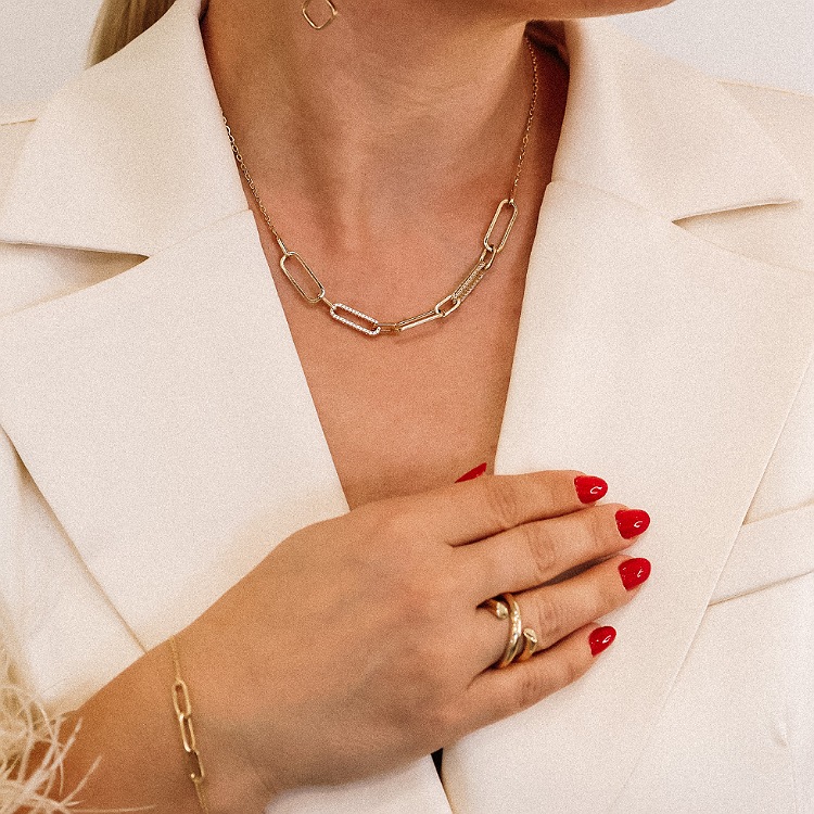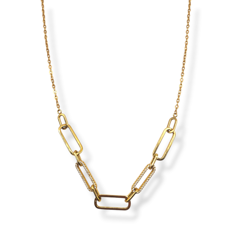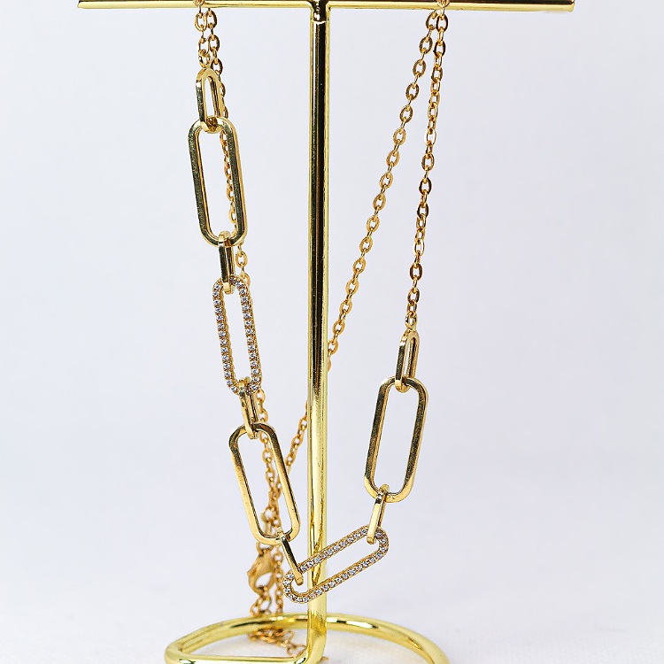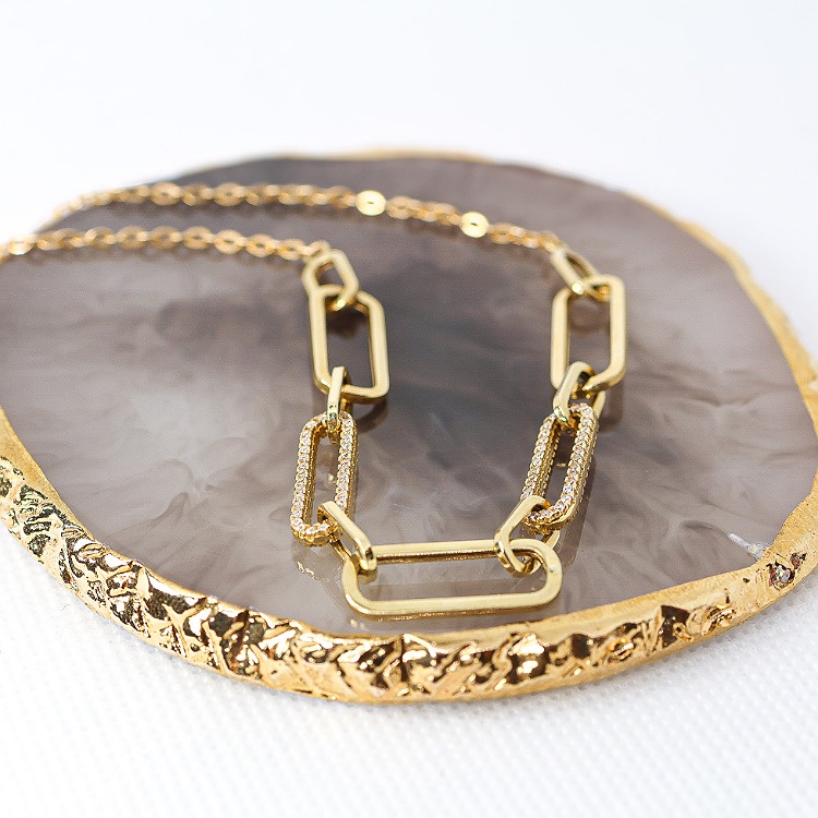 Złoty naszyjnik o splocie agrafki z dodatkiem cyrkonii na delikatnym łańcuszku o splocie ankierki z zapięciem na karabińczyj regulującym długość.