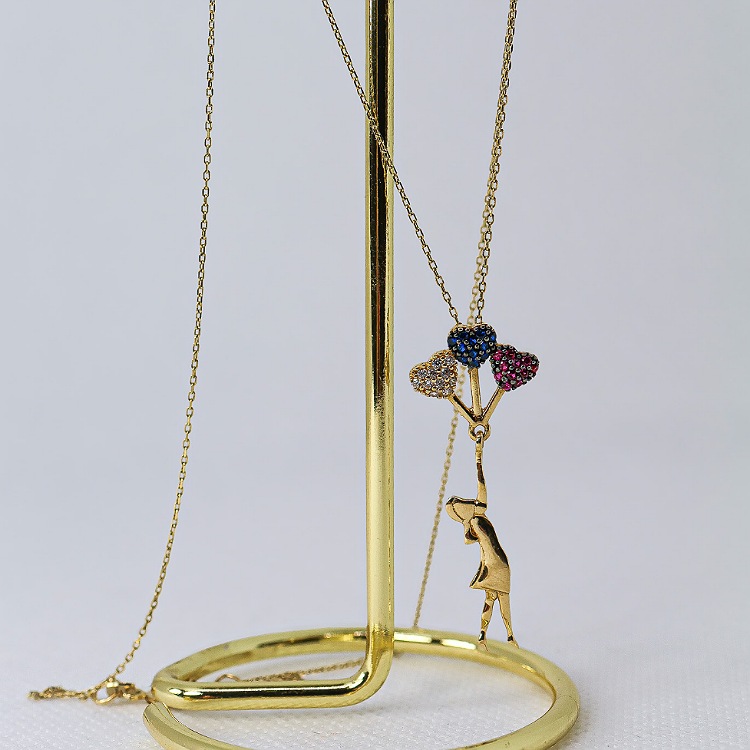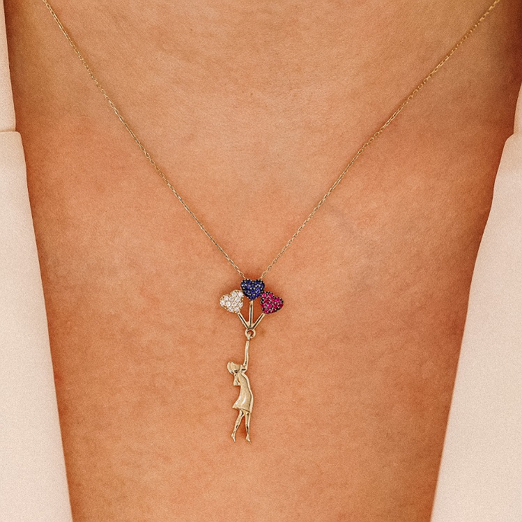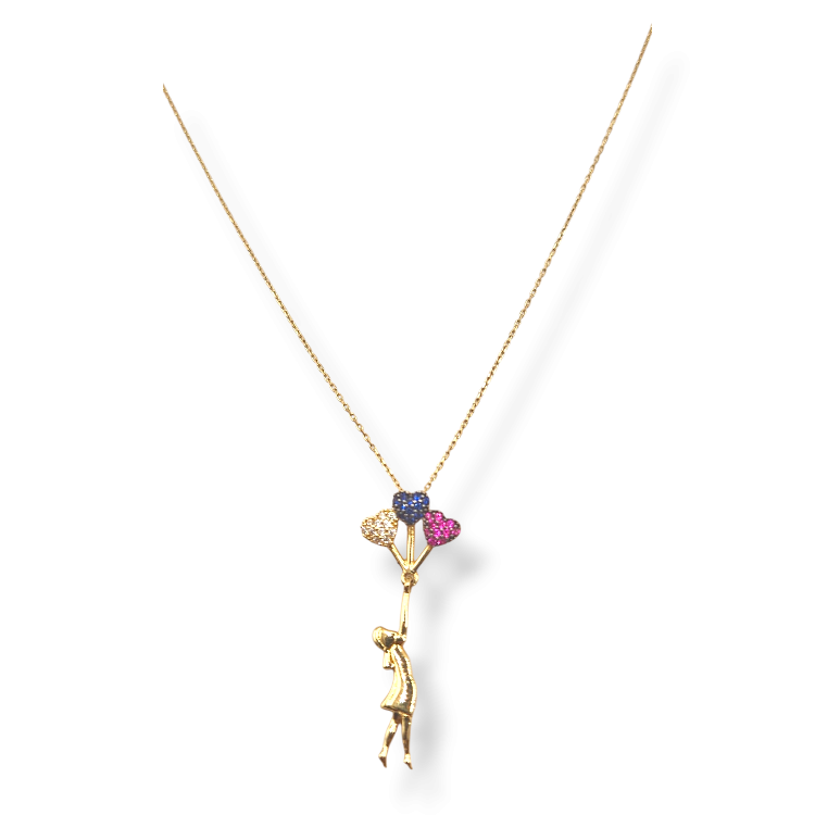 Złoty naszyjnik z zawieszką w kształcie dziewczynki trzymającej baloniki z białymi, niebieskimi i różowymi cyrkoniami na delikatnym łańcuszku o splocie ankierki z zapięciem federing regulującym długość.