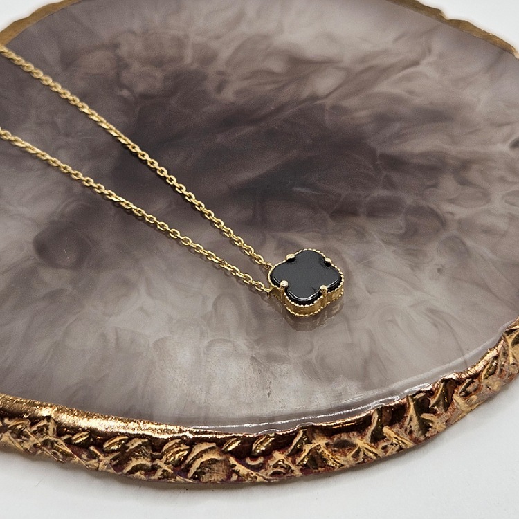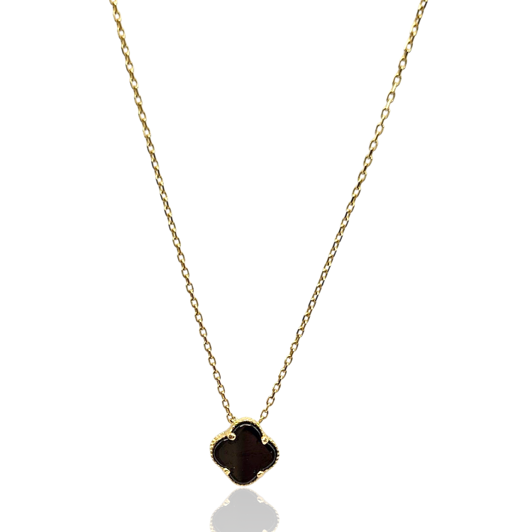 Złota celebrytka z koniczynką z czarnej masy perłowej na delikatnym łańcuszku o splocie ankierki z zapięciem typu federing.
