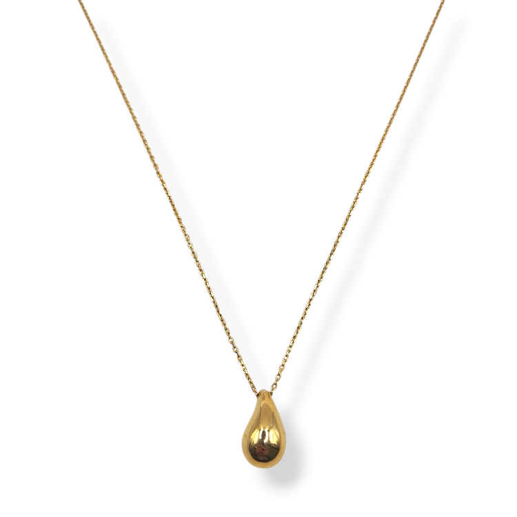 Złoty naszyjnik z zawieszką w kształcie kropli na delikatnym łańcuszku o splocie ankierki z zapięciem na federing.