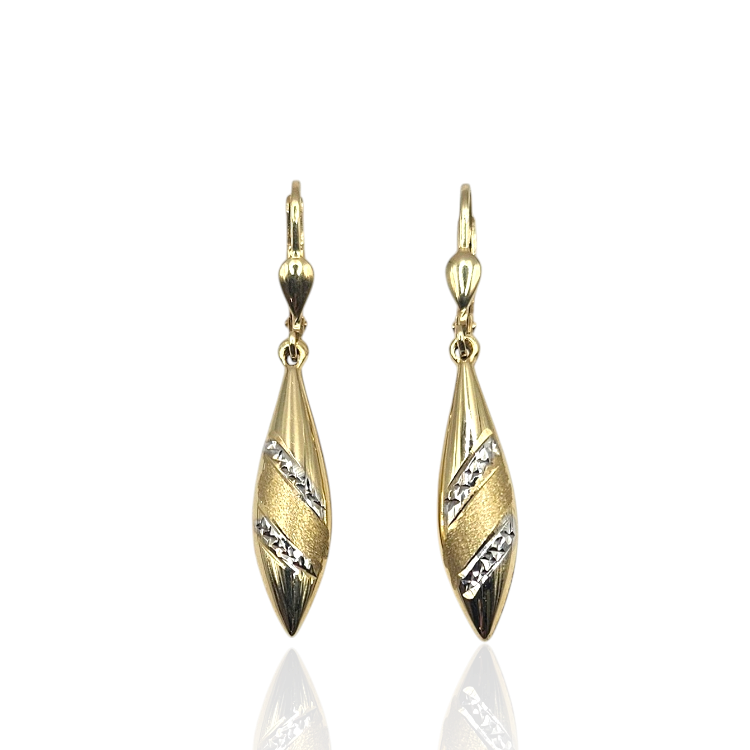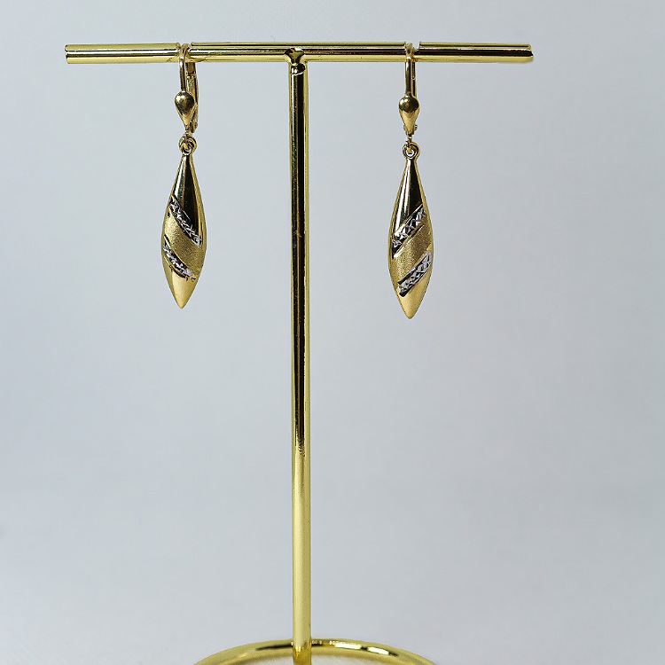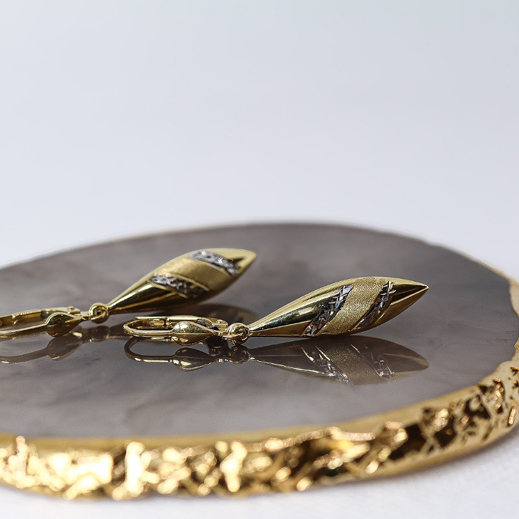 Złote kolczyki podłużne z białym złotem i diamentowaniem z zapięciem angielskim.