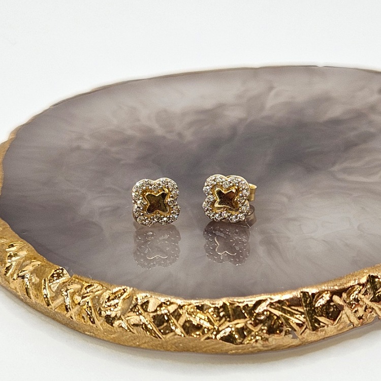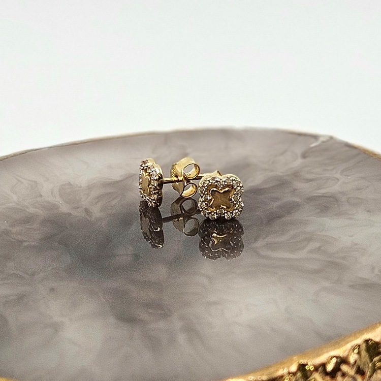Złote kolczyki w kształcie czterolistnej koniczynki z drobnymi cyrkoniami. Zapięcie na sztyft.