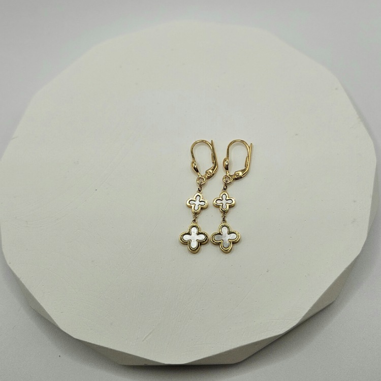Złote kolczyki  długie koniczynki wypełnione masą perłową na angielskim zapięciu.