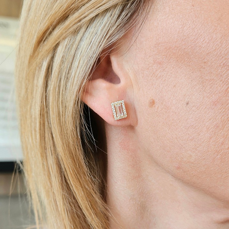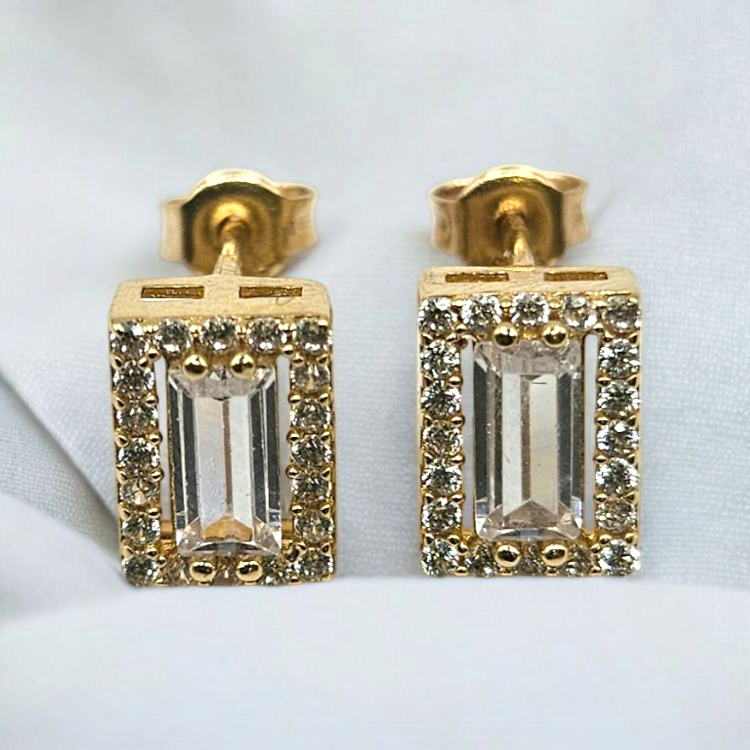 Złote kolczyki z kwadratową cyrkonią obsadzoną drobnymi białymi cyrkoniami. Zapięcie na sztyft.