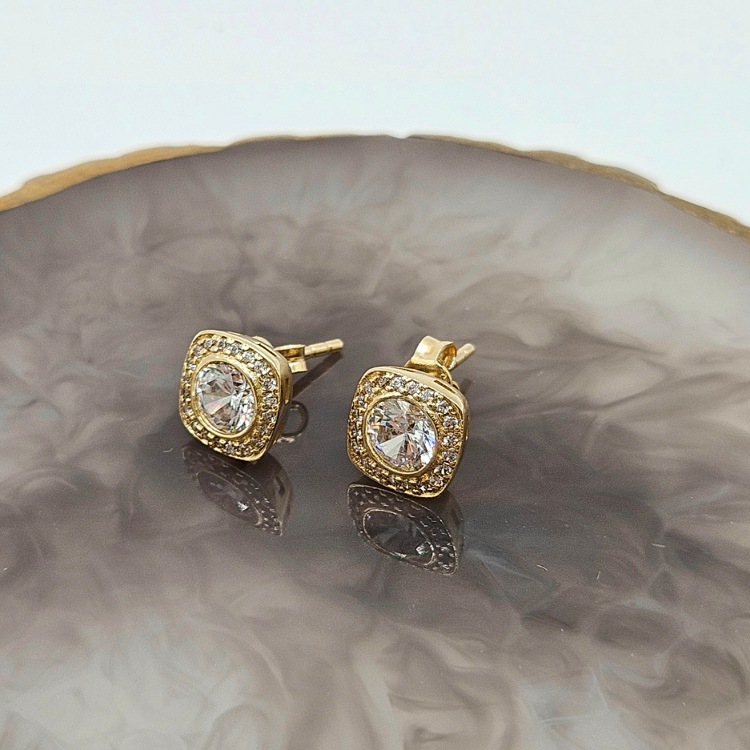 Złote kolczyki z dużą okrągłą cyrkonią obsadzona drobnymi cyrkoniami w kwadracie. Zapięcie na sztyft.