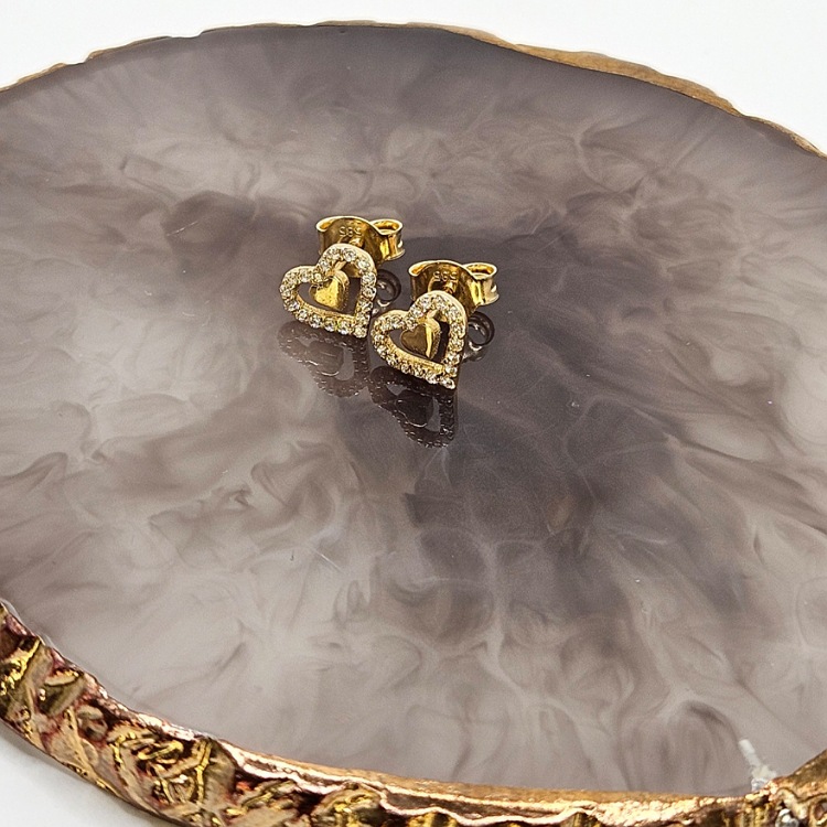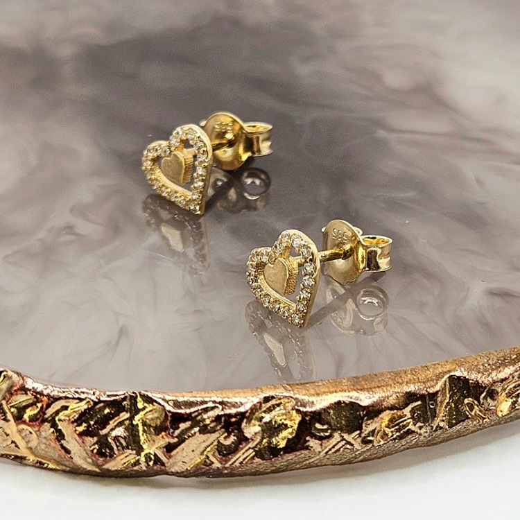 Złote kolczyki serca w sercu cyrkonie na zapięcie sztyft.
