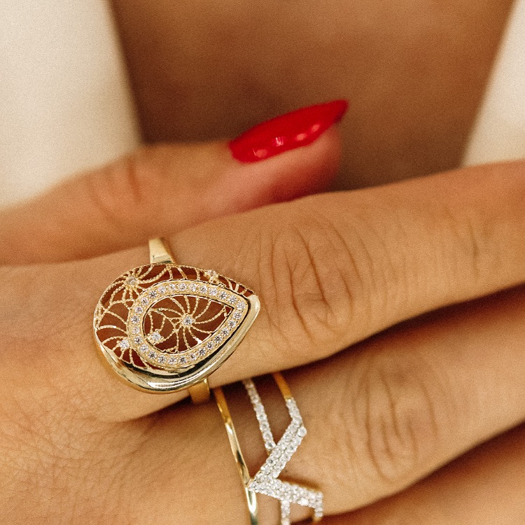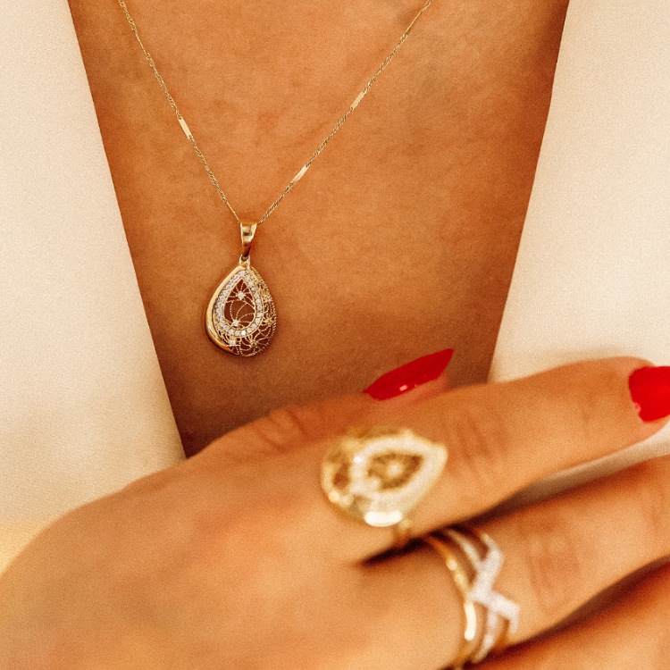 Złoty komplet składa się z łańcuszka o splocie singapur z zawieszką w kształcie łezki oraz pierścionka.