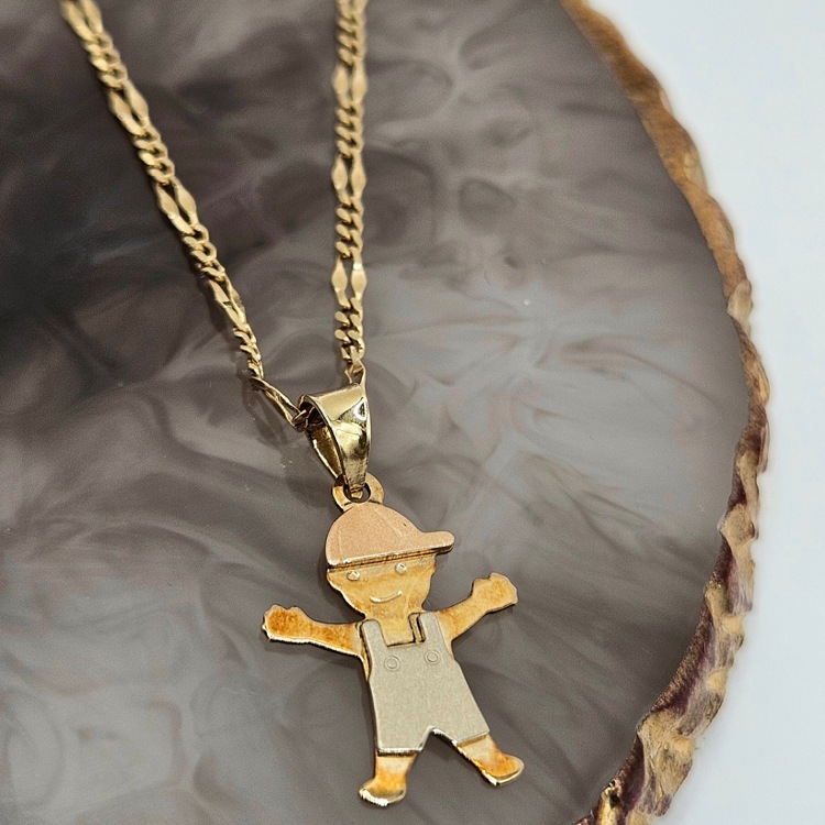 Złoty komplet składa się z zawieszki o kształcie chłopczyka oraz delikatny łańcuszek o splocie usta na zapięcie typu federing.