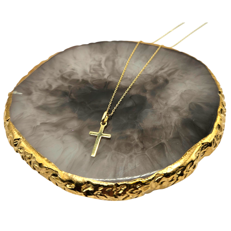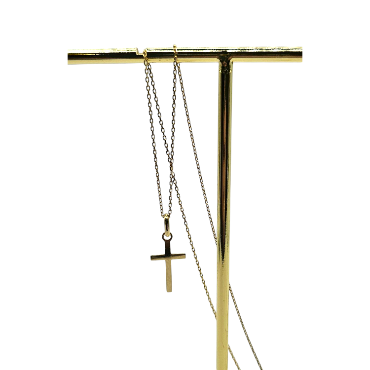 Złoty komplet składa się z łańcuszka o splocie ankierki o długości 45 cm oraz gładki krzyżyk.