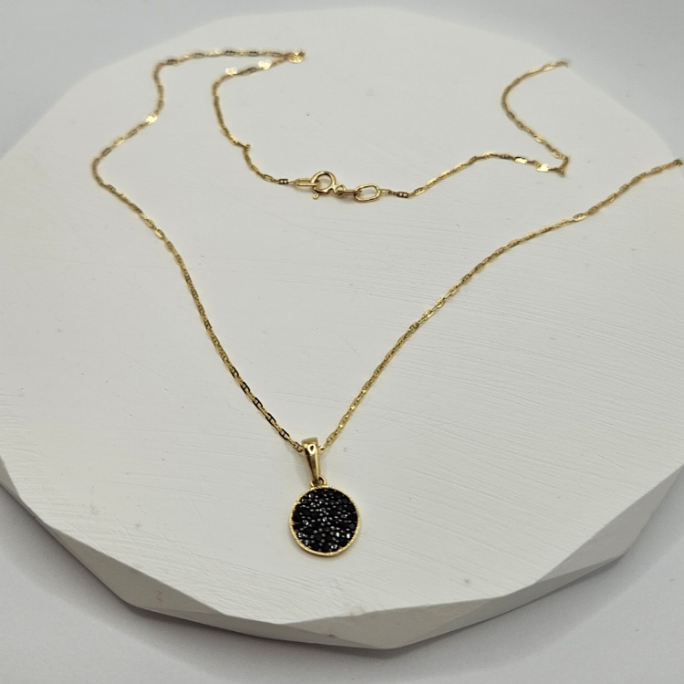 Złoty komplet składa się z łańcuszka o splocie gucci/drabinka o długości 45 cm oraz okrągłej zawieszki wysadzanej czarnymi cyrkoniami.