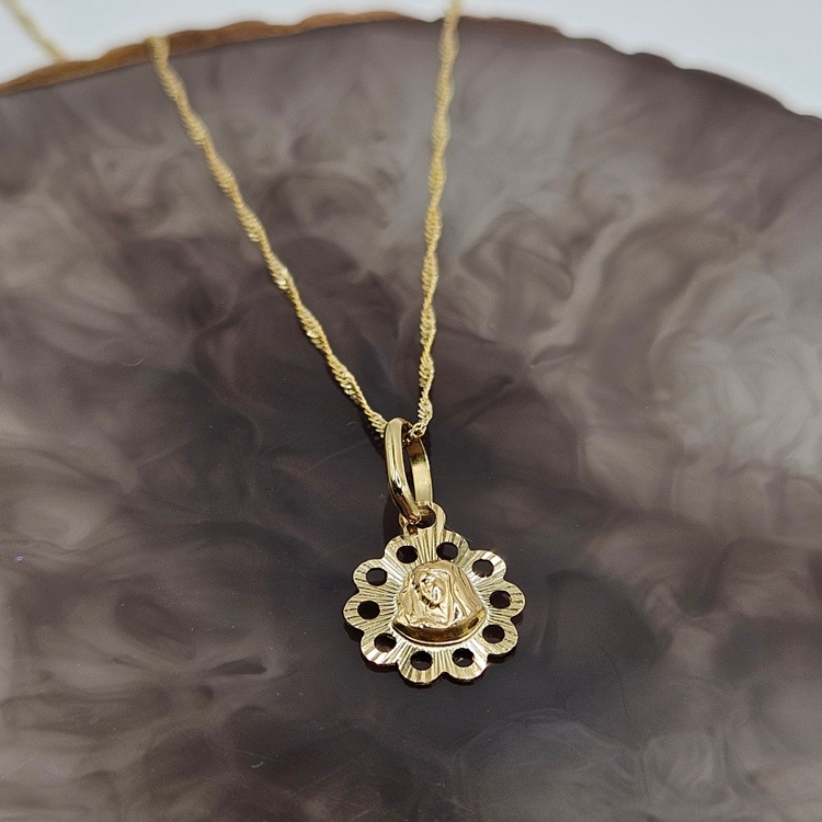 Złoty komplet składa się z łańcuszka o splocie singapur o długości 45 cm oraz medalika z postacią Matki Boskiej.
