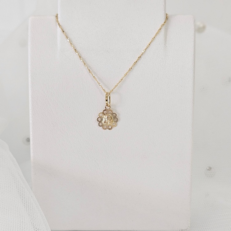 Komplet złoty – łańcuszek singapur + medalik kwiat ażur – złoto próba 585.