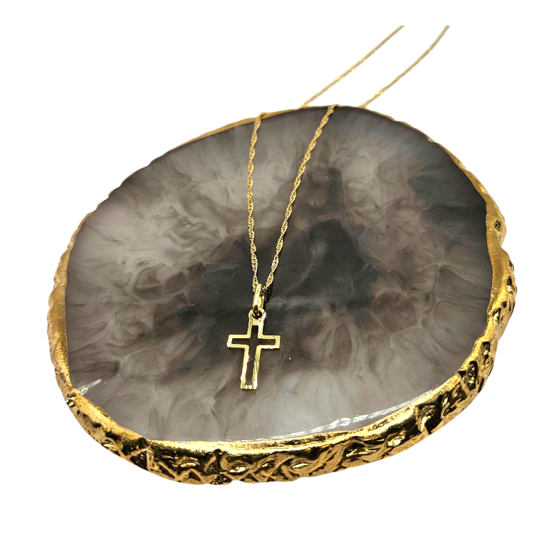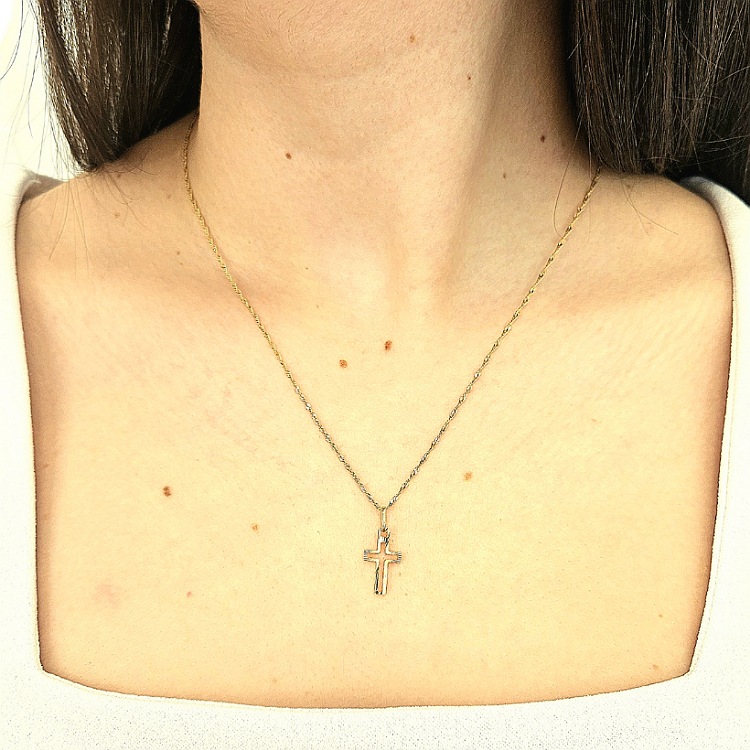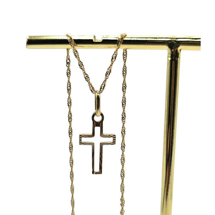 Złoty komplet składa się z łańcuszka o splocie singapurka o długości 45 cm oraz krzyżyk z nacięciami.