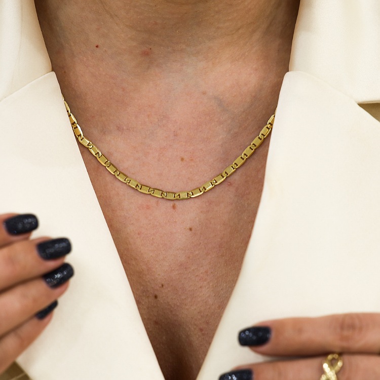 Złoty łańcuszek ozdobny blaszka z zapięciem typu fasolka.