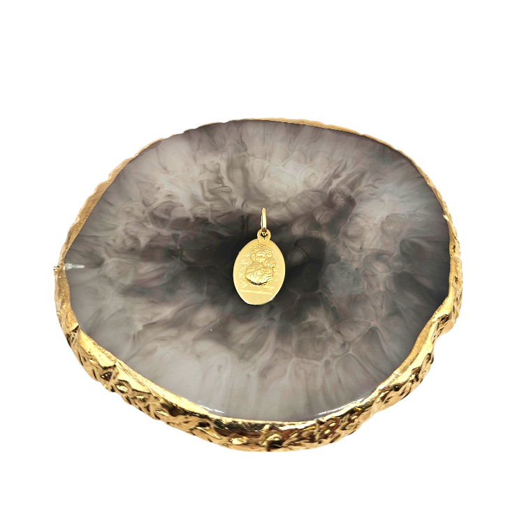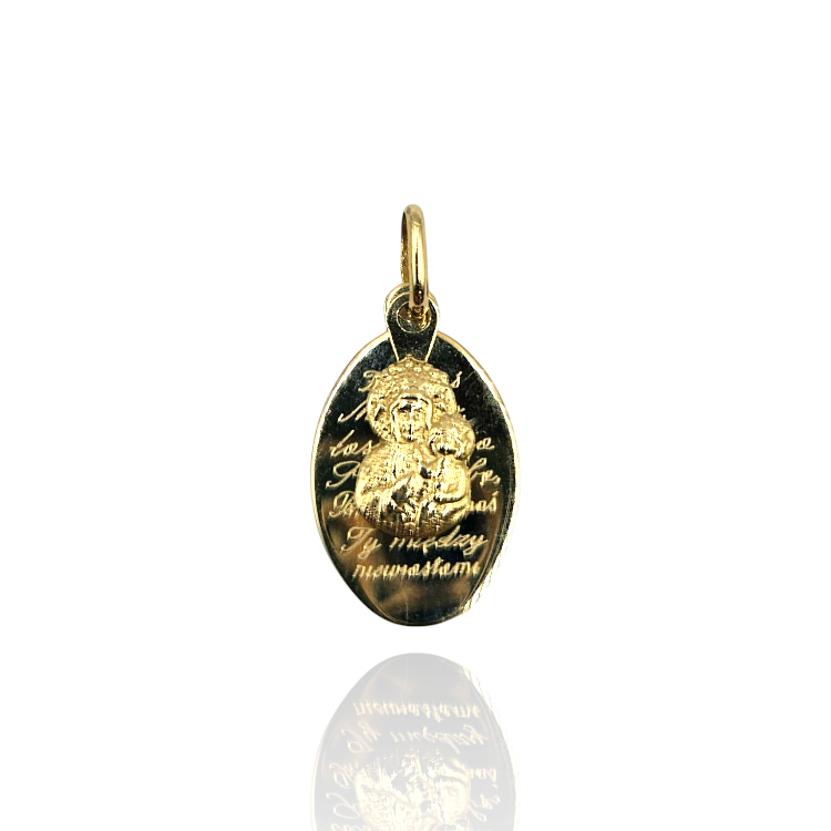 Złoty medalik z wizerunkiem Matki Boskiej Częstochowskiej z wygrawerowaną modlitwą na blaszce, ruchome elementy.