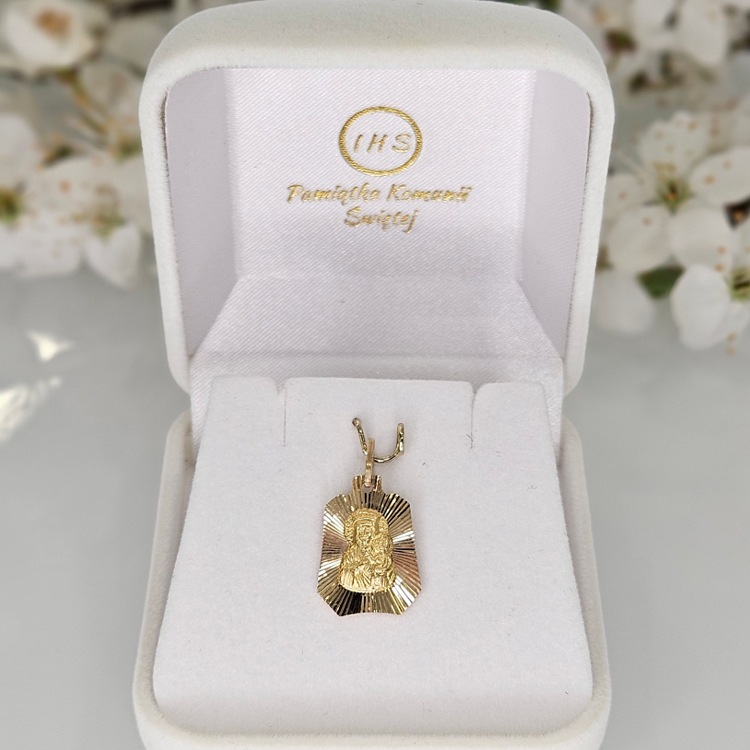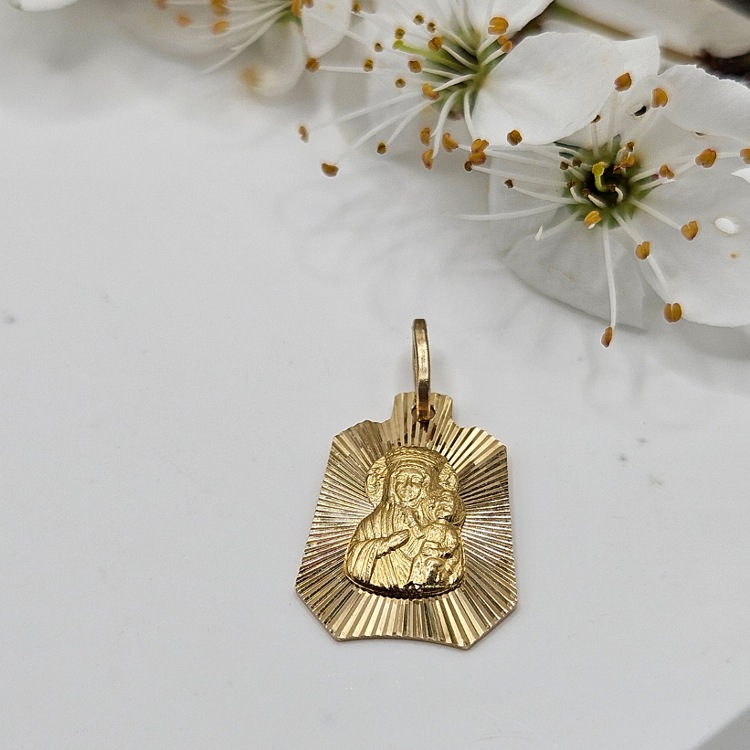 Złoty medalik blaszka z promieniami i wizerunkiem Matki Boskiej Częstochowskiej.