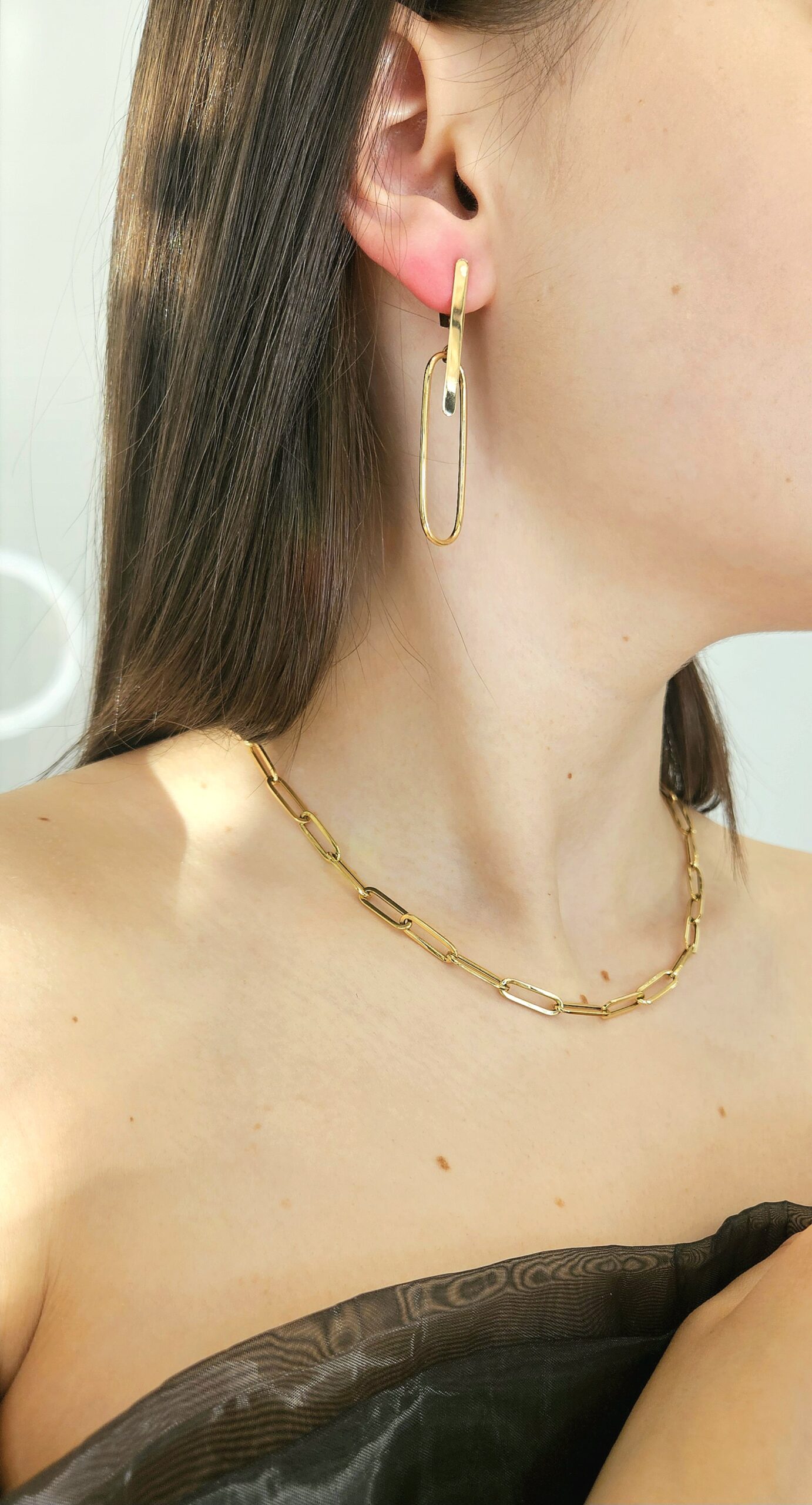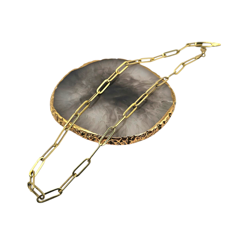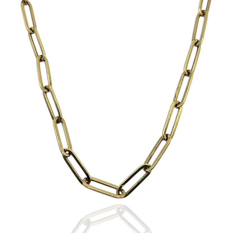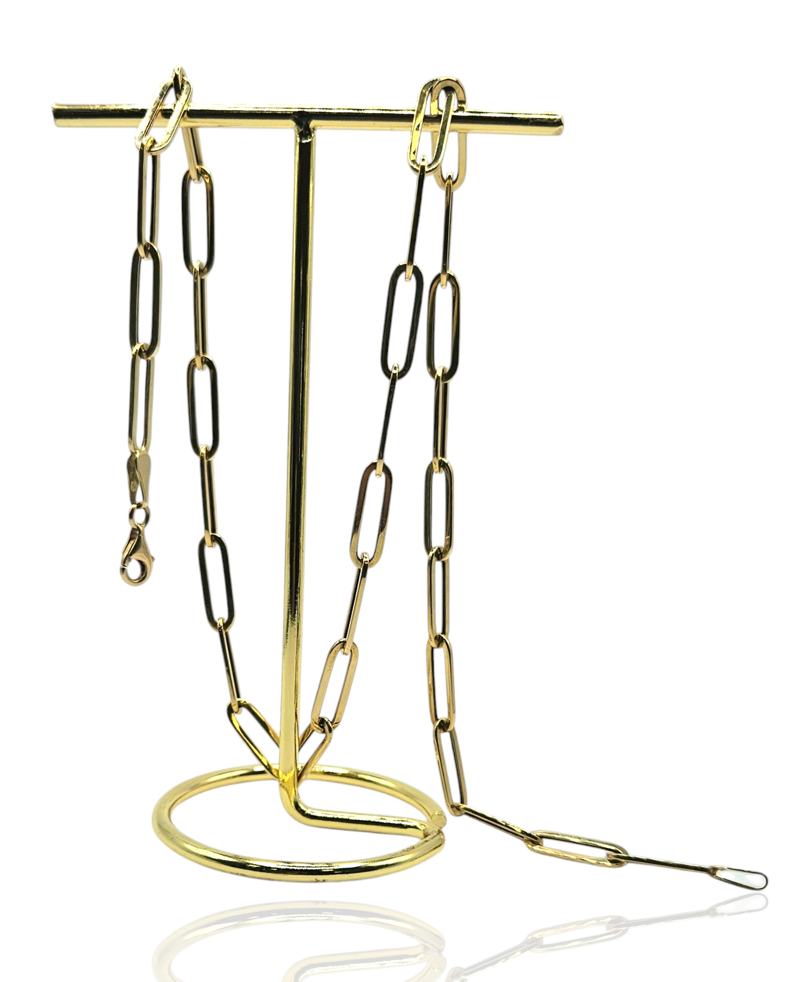 Złota naszyjnik wydłużone ogniwka z zapięciem na karabińczyk z możliwością regulacji długości.