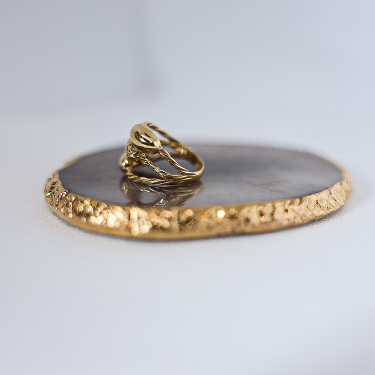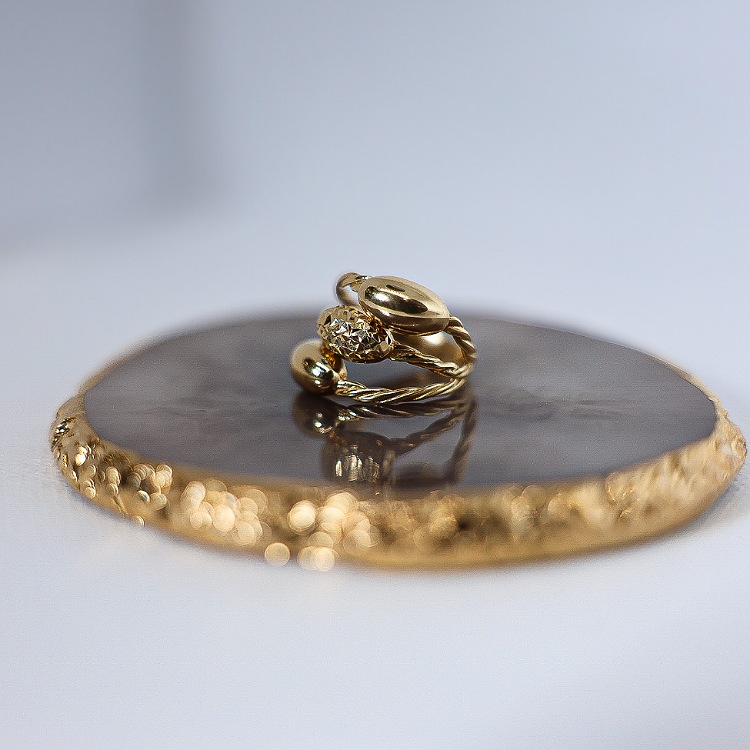 Złoty pierścionek z trzema kulkami z dodatkiem diamentowania.