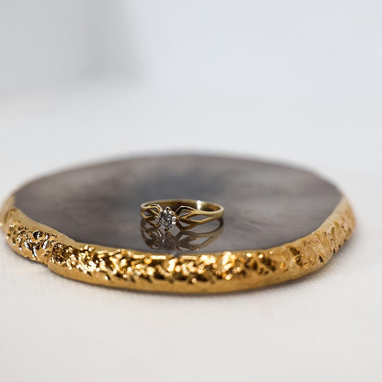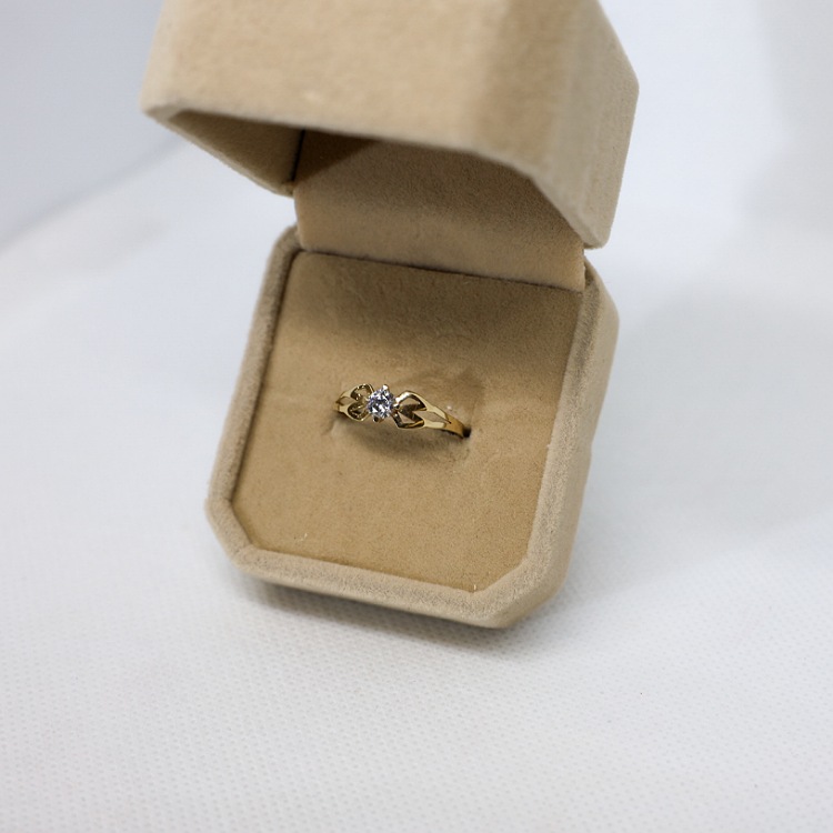 Złoty pierścionek z jedną cyrkonią obsadzoną w cztery łapki.