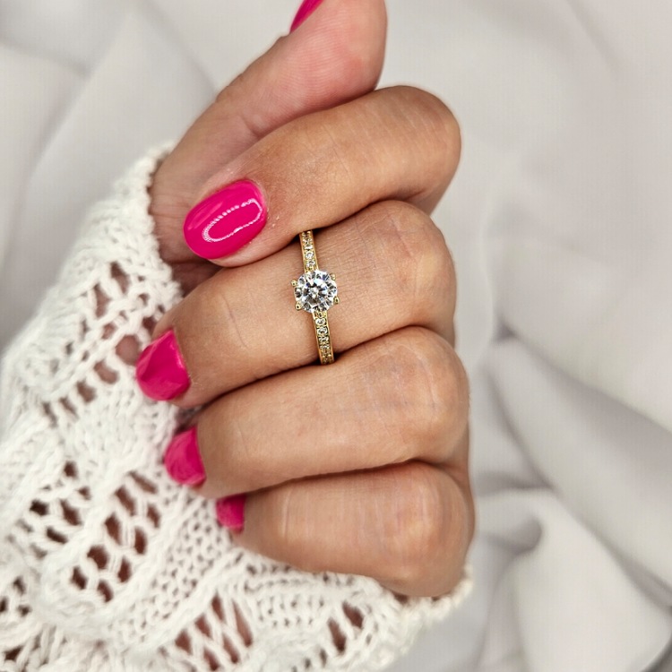 Złoty pierścionek z dużą cyrkonią na obrączce wysadzanej drobnymi białymi cyrkoniami.