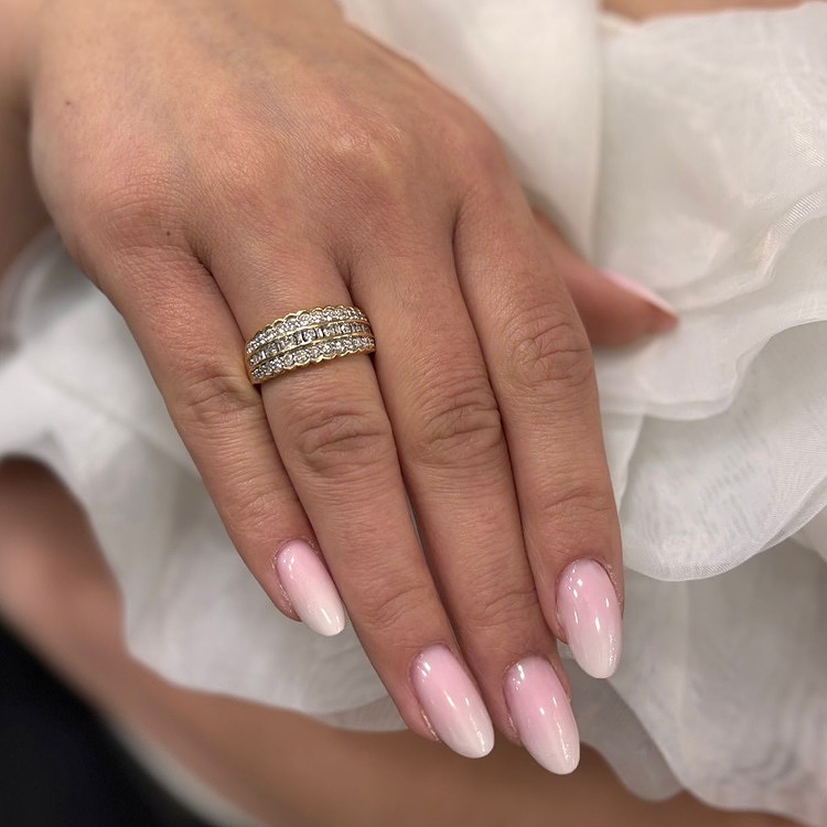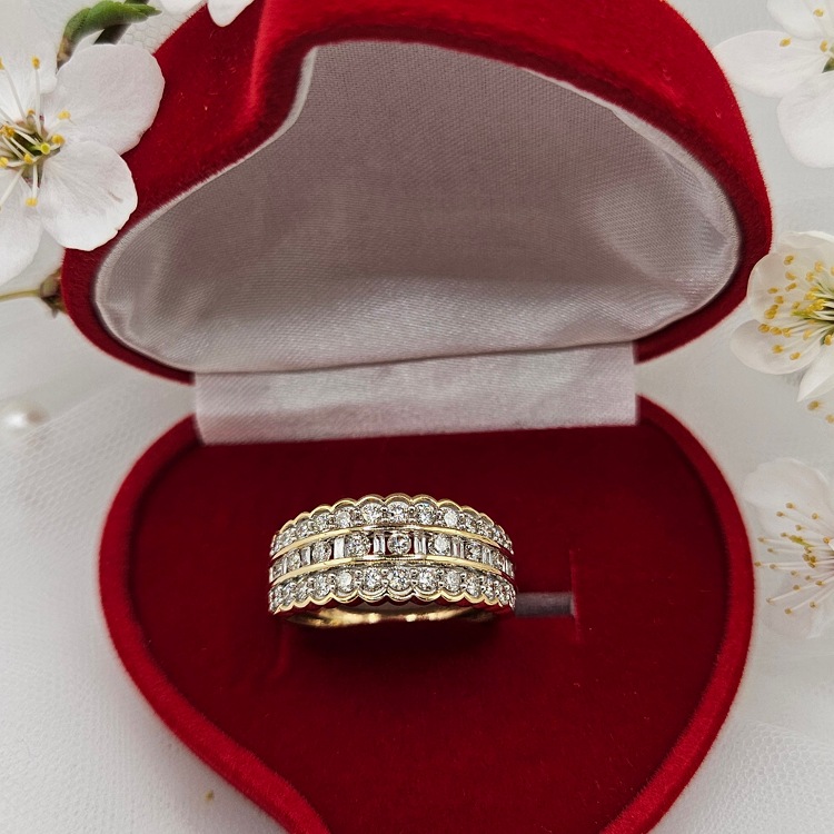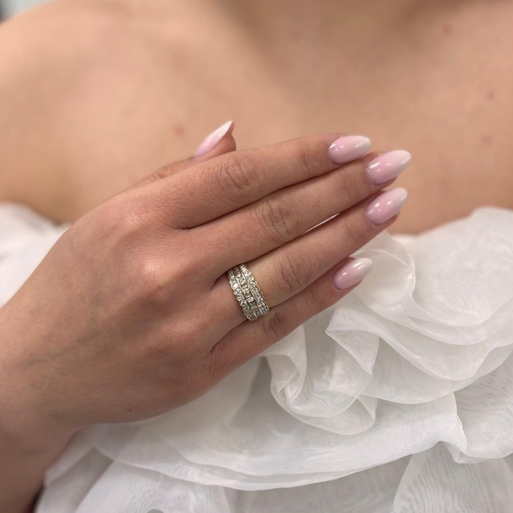 Złoty pierścionek z 43 diamentem obsadzonymi w trzech rzędach.