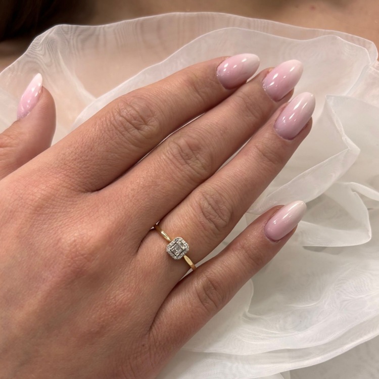 Złoty pierścionek z 21 diamentami obsadzonymi w kształt kwadratu.
