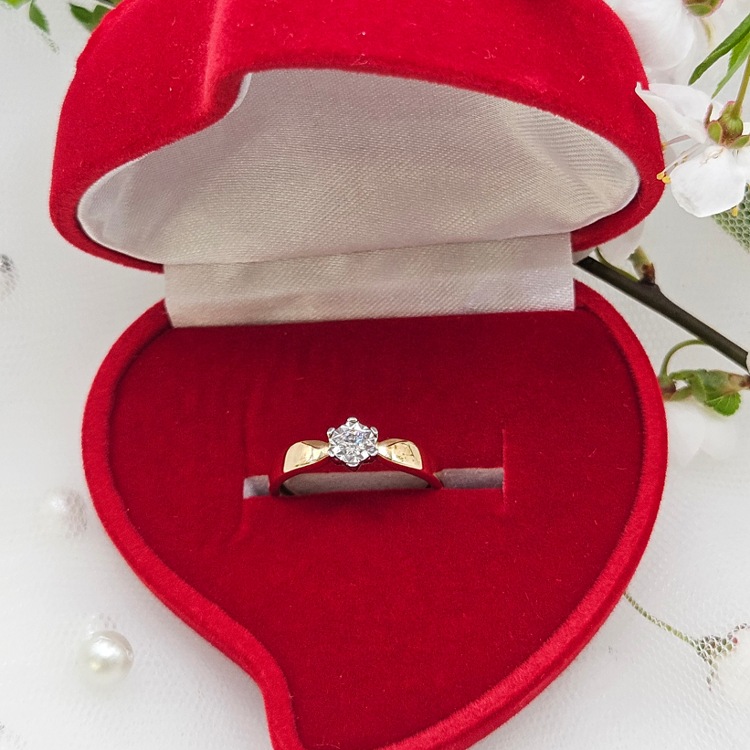 Złoty pierścionek z 1 okrągłym diamentem obsadzonej w koronie z białego złota.