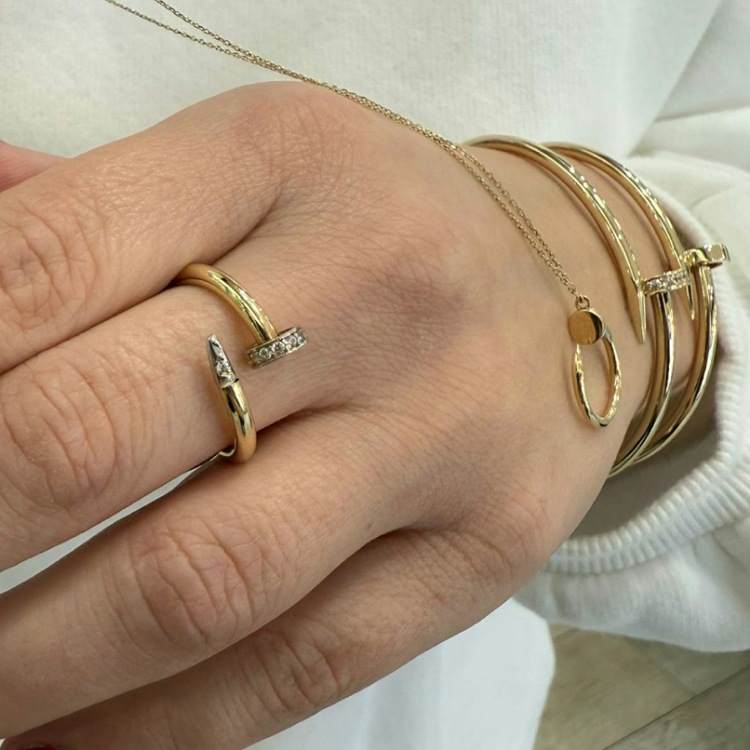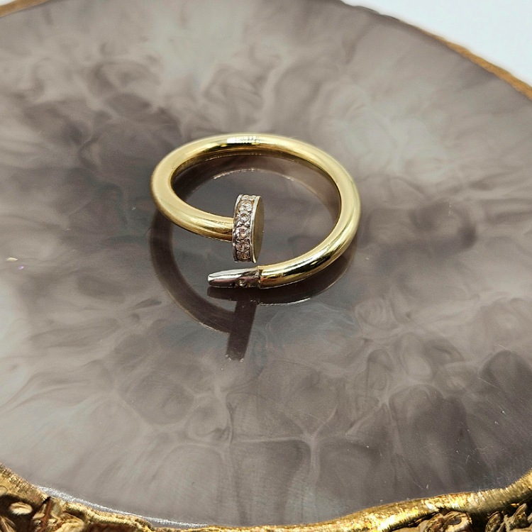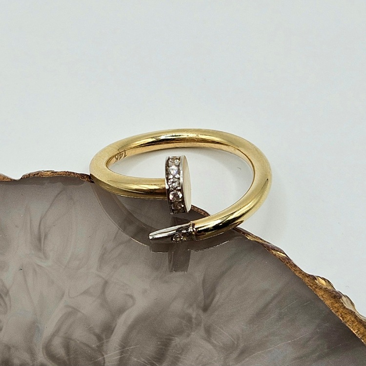 Złoty pierścionek w kształcie gwoździa z dodatkiem białych cyrkonii.