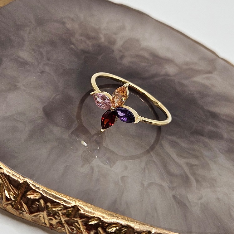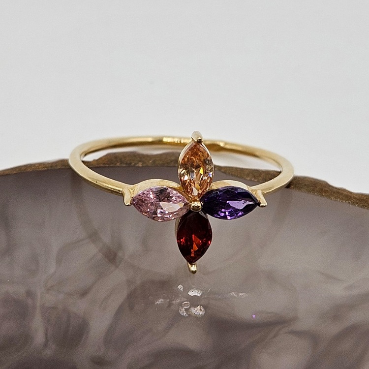 Złoty pierścionek z kolorowymi cyrkoniami w kształcie kwiatka.