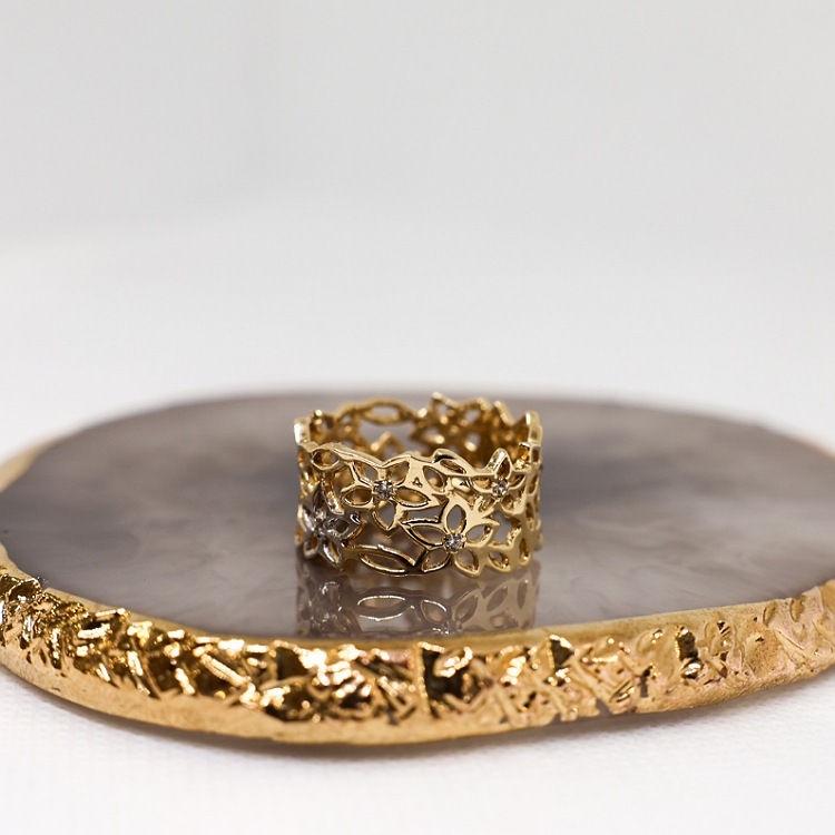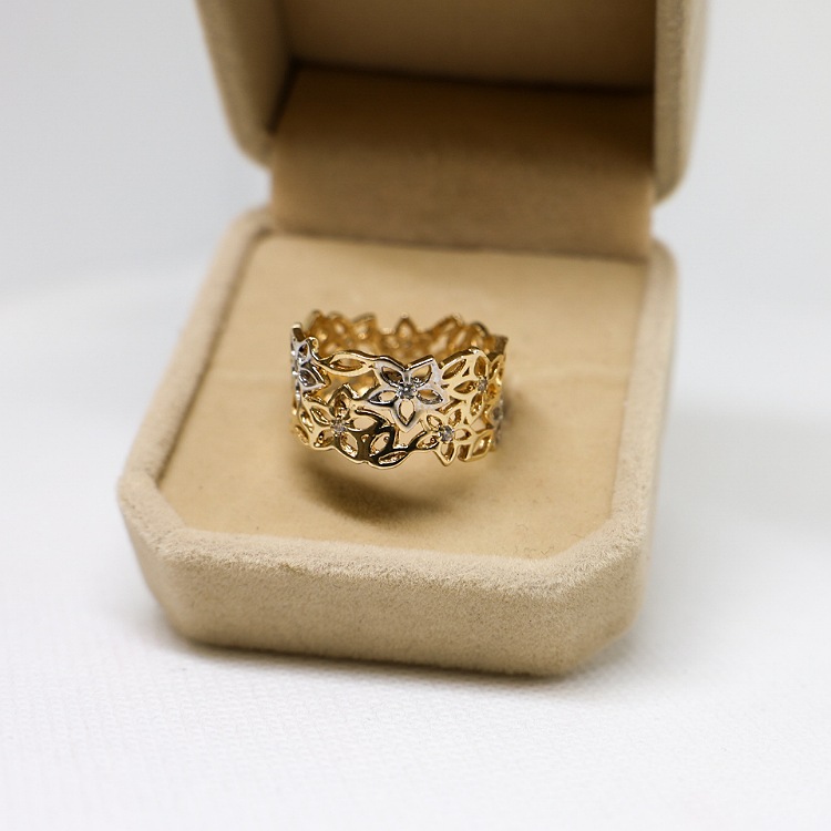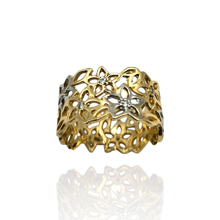 Złoty pierścionek ażurowy, szeroki z motywem kwiatów z dodatkiem cyrkonii i białego złota.