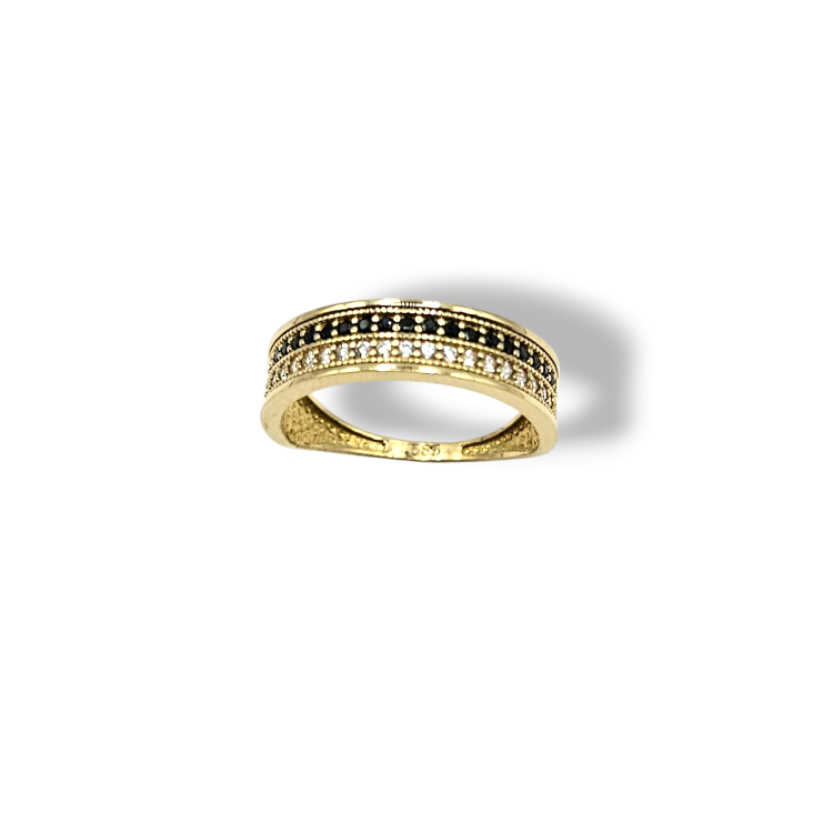 Złoty pierścionek o kształcie obrączki ze zwężonym dołem wypełniony rzędem białych i czarnych cyrkoni.