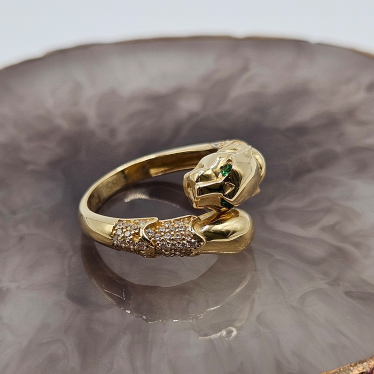 Złoty pierścionek pantera z dodatkiem białych cyrkonii.