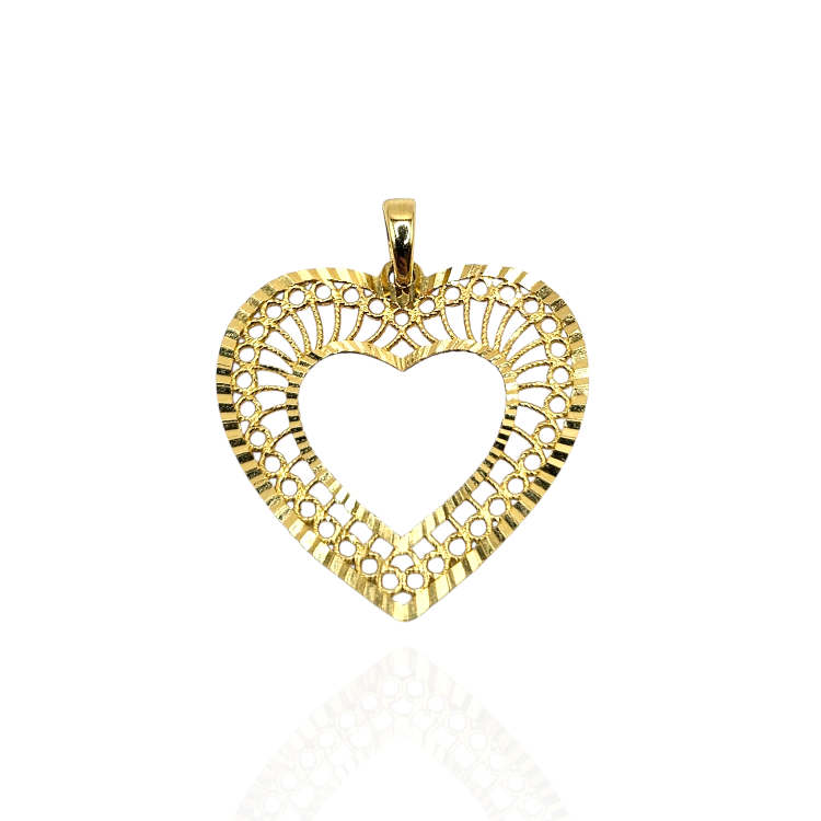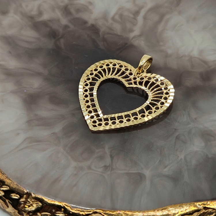 Złota zawieszka w kształcie ażurkowego serca.