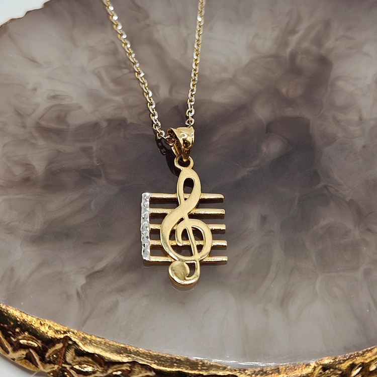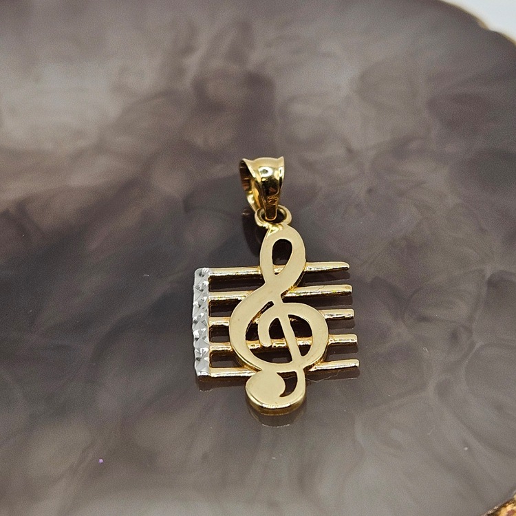 Złota zawieszka w kształcie klucza na pięciolinii z dodatkiem białego złota.