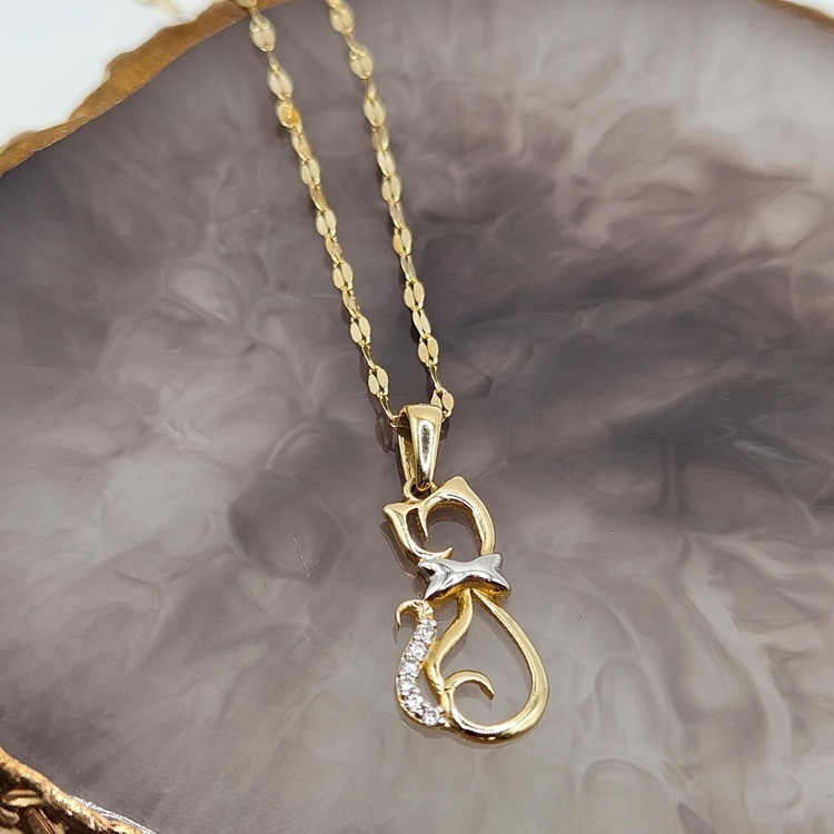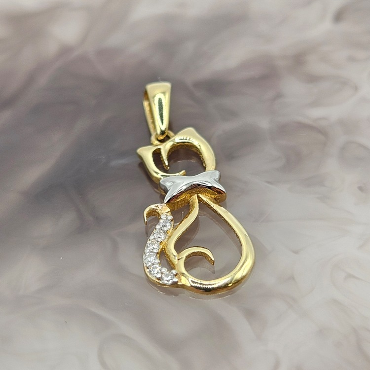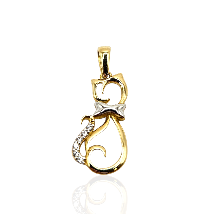 Złota zawieszka w kształcie kota z dodatkiem białego złota i drobnych cyrkonii.