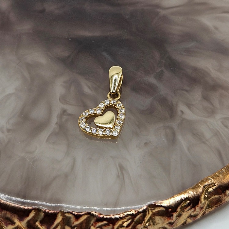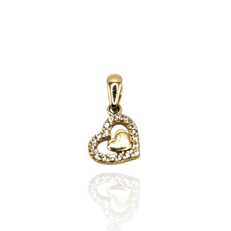 Złota zawieszka serce w sercu z dodatkiem drobnych białych cyrkonii.