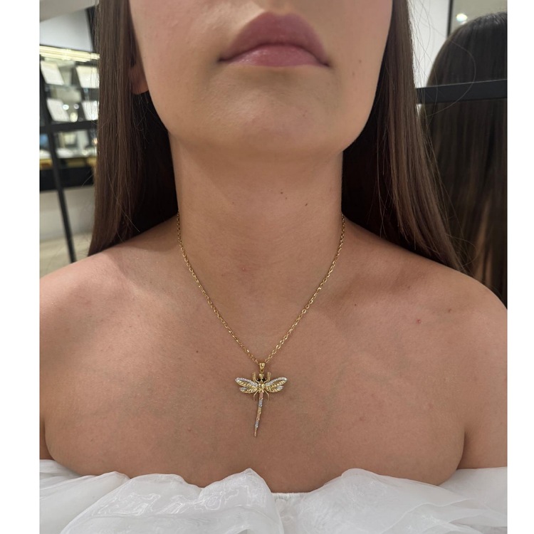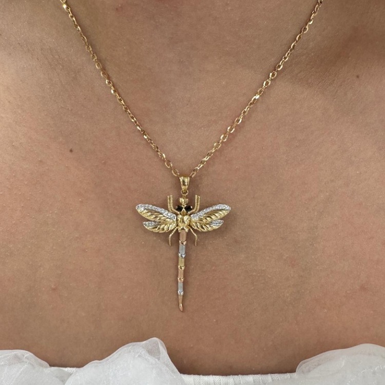Złota zawieszka w kształcie ważki. 3 kolory złota na ogonie, przyozdobiona czarnymi i białymi cyrkoniami.